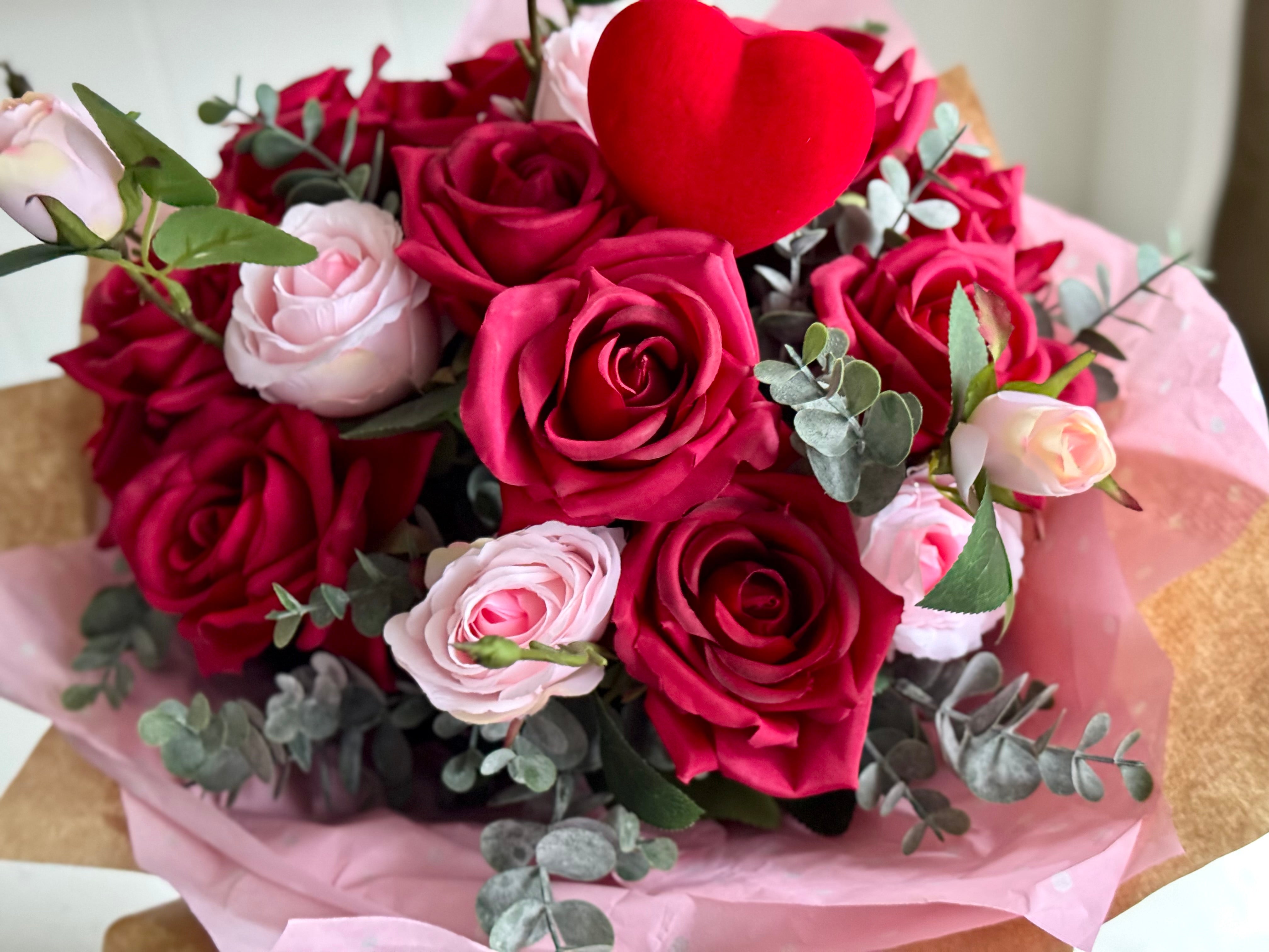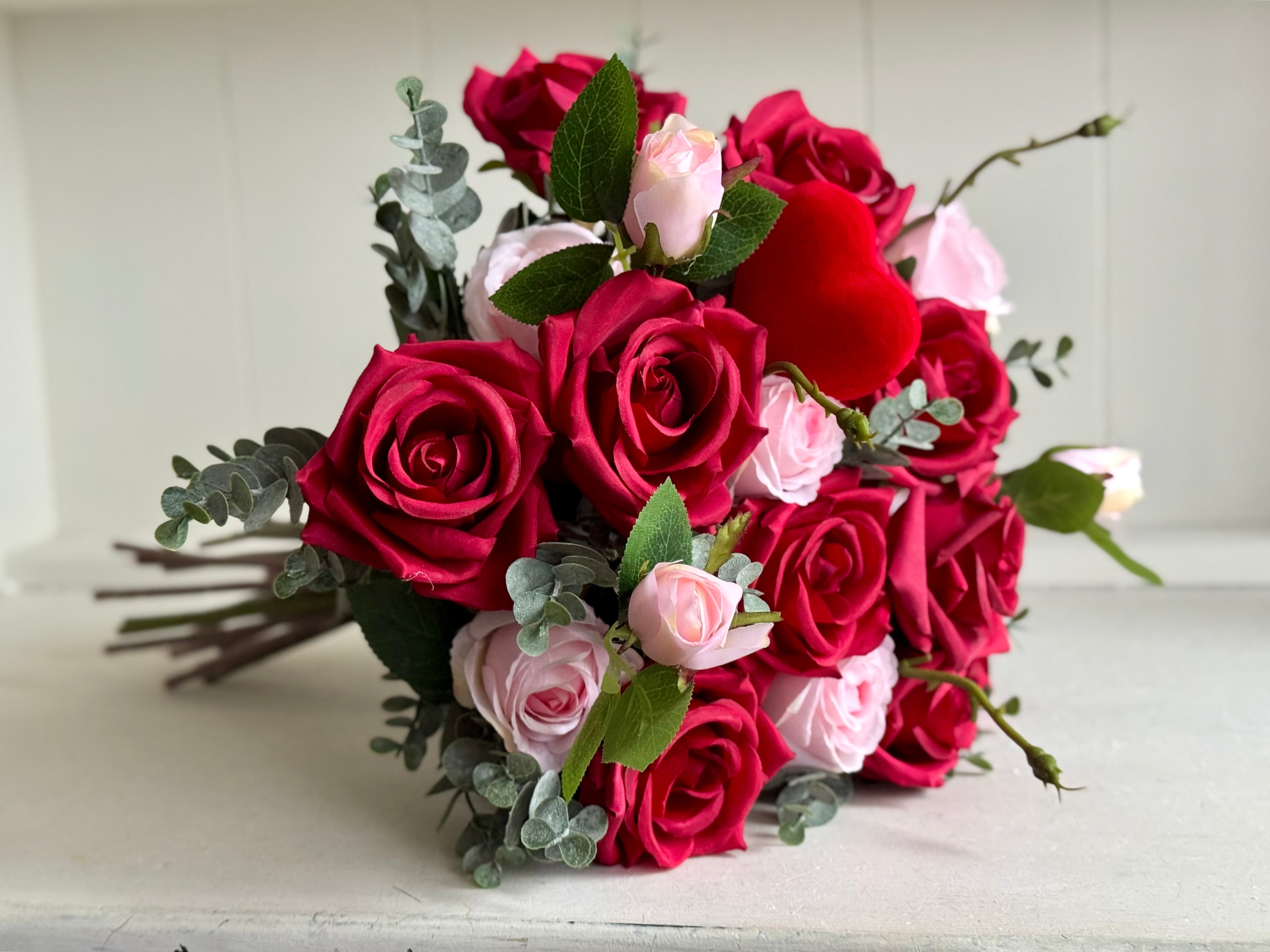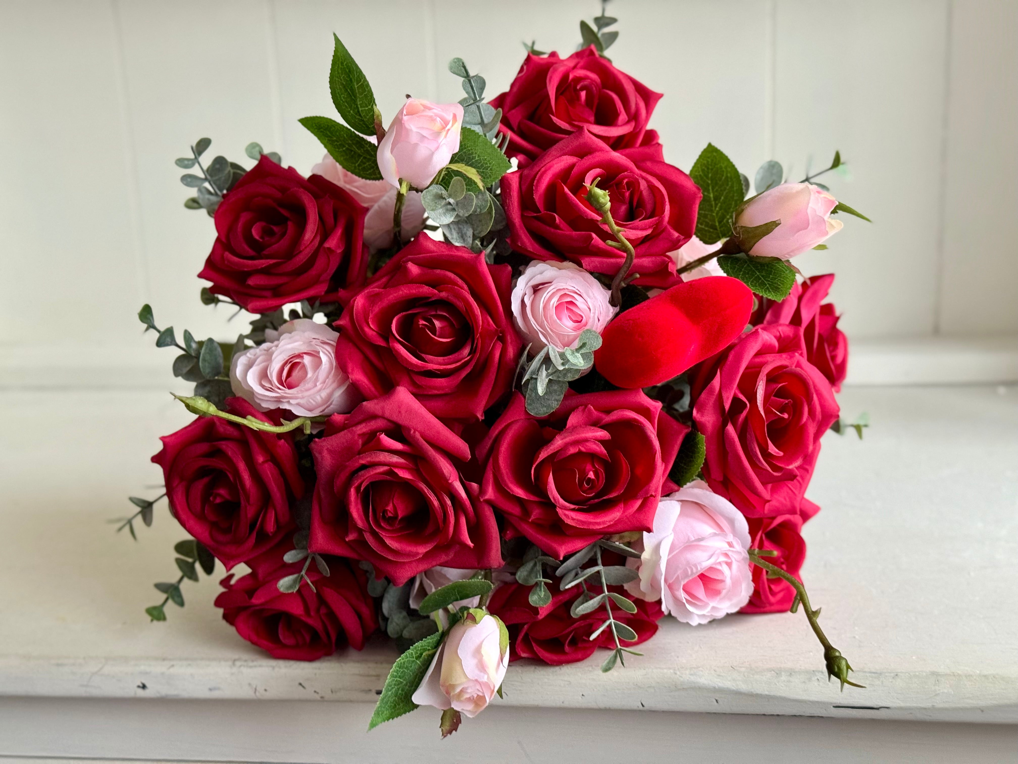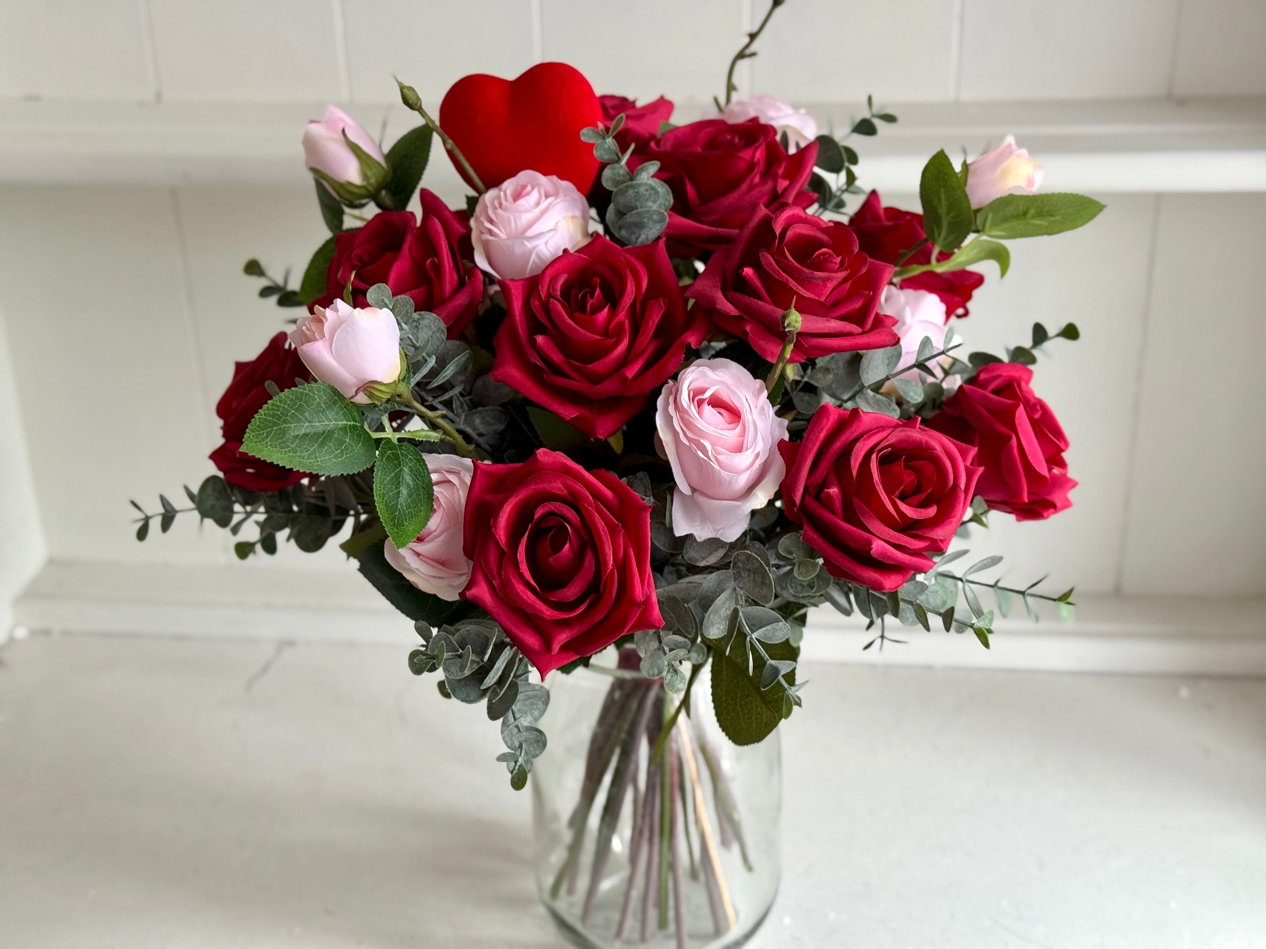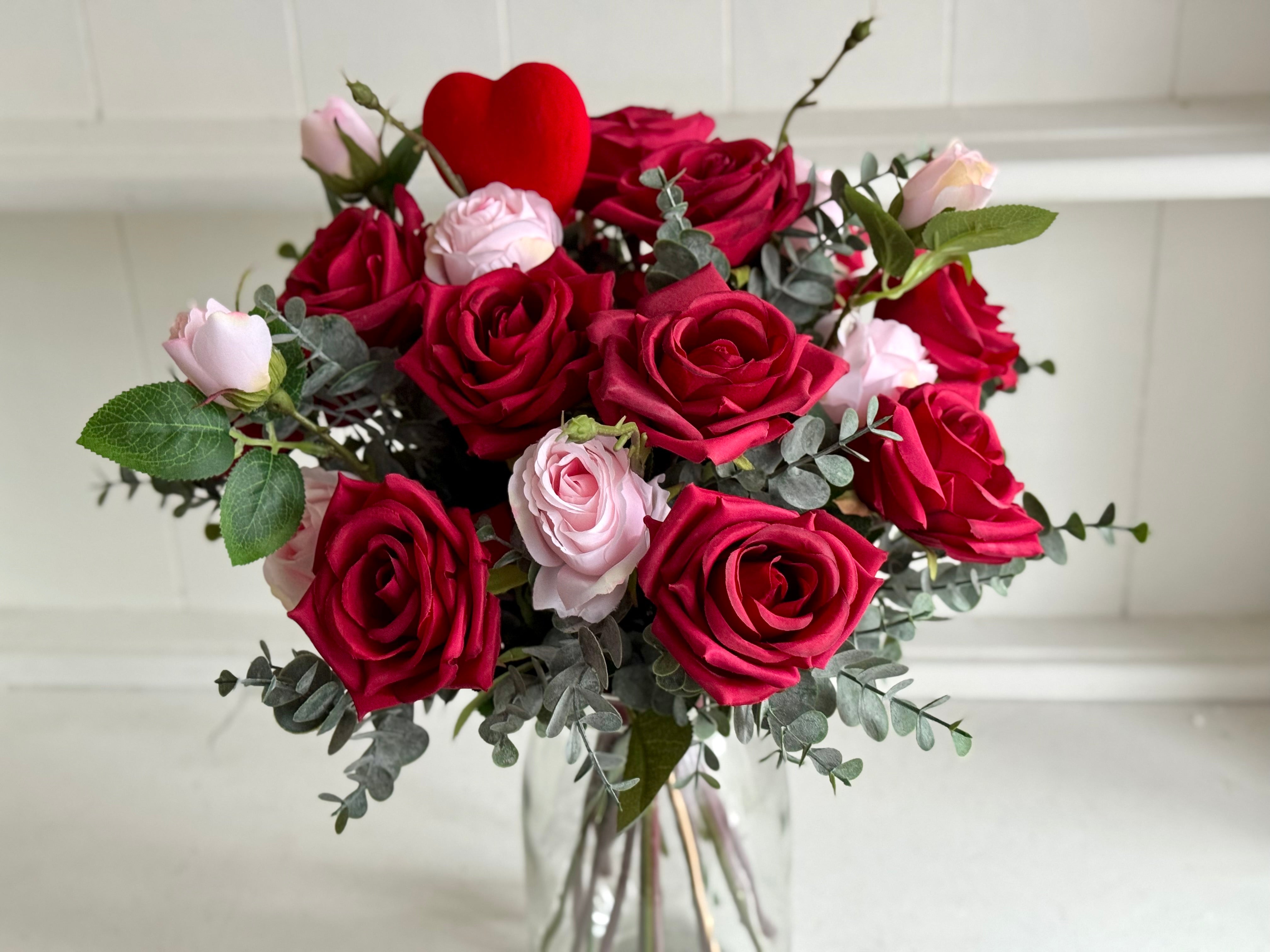 Artificial flower arrangement including a mix of beautiful red roses, pale pink spray roses, a decorative velvet heart pick and eucalyptus greenery. The flowers are secured with florist tape and finished with ribbon, ready to place straight into a vase. *Please note the vase is not included, the price is for flowers and greenery only.