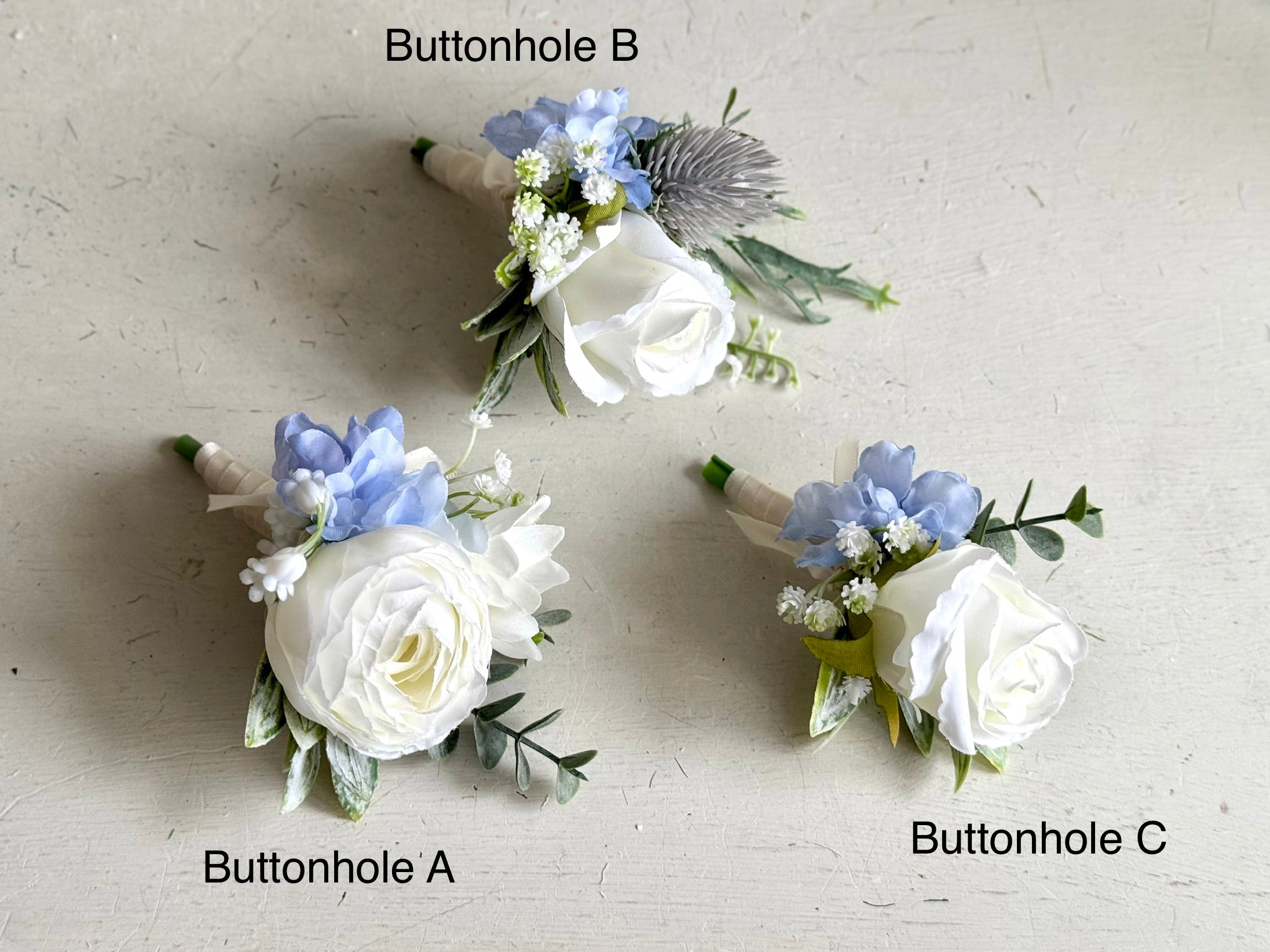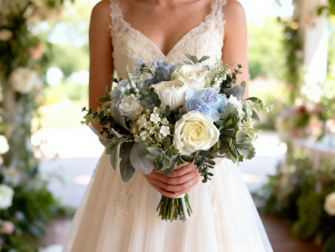 Elegant pale blue, dusky blue and white artificial wedding flowers designed with roses, hydrangea, thistle, viburnum and delphinium with eucalyptus, lambs ear and sage greenery.