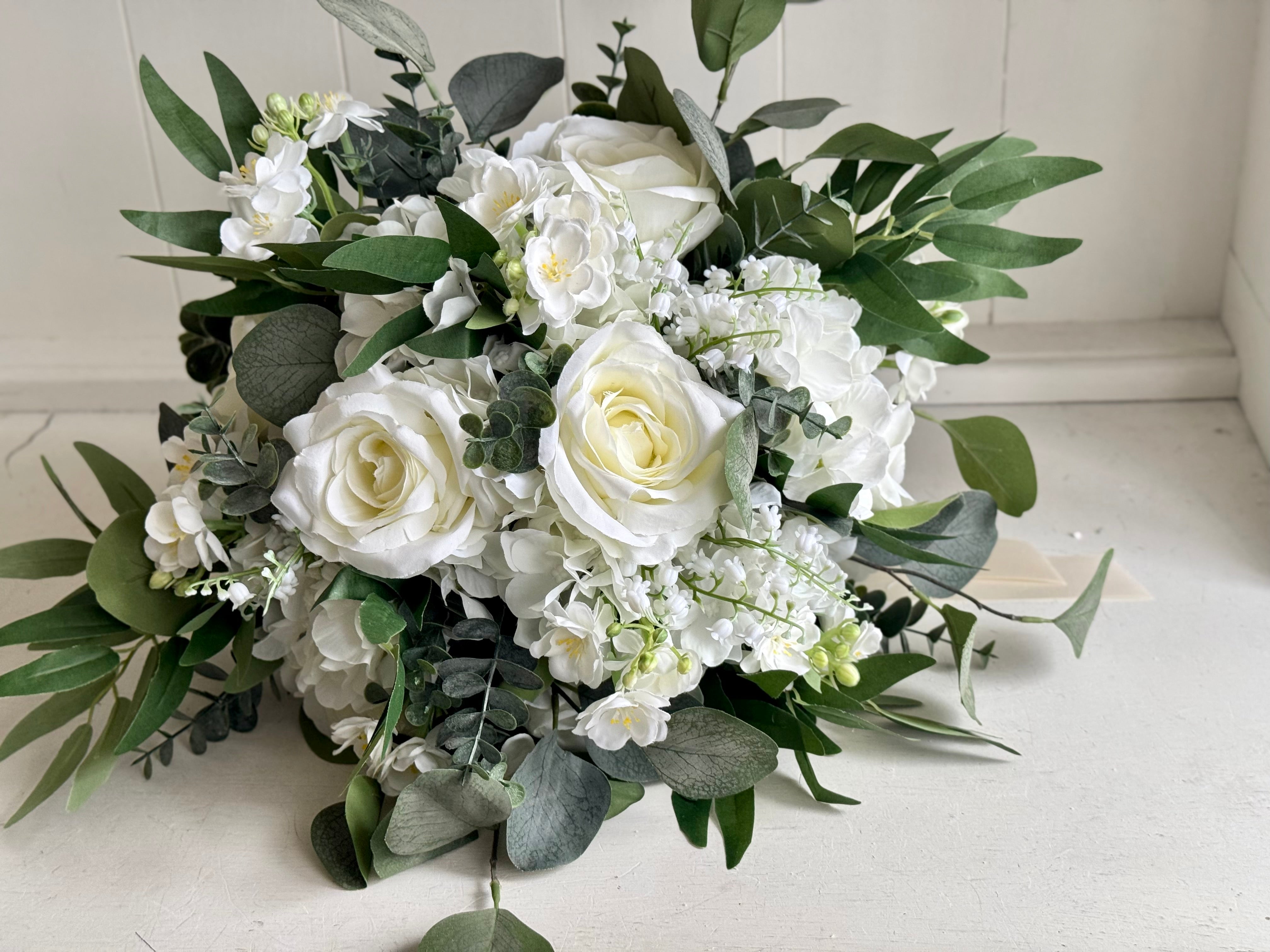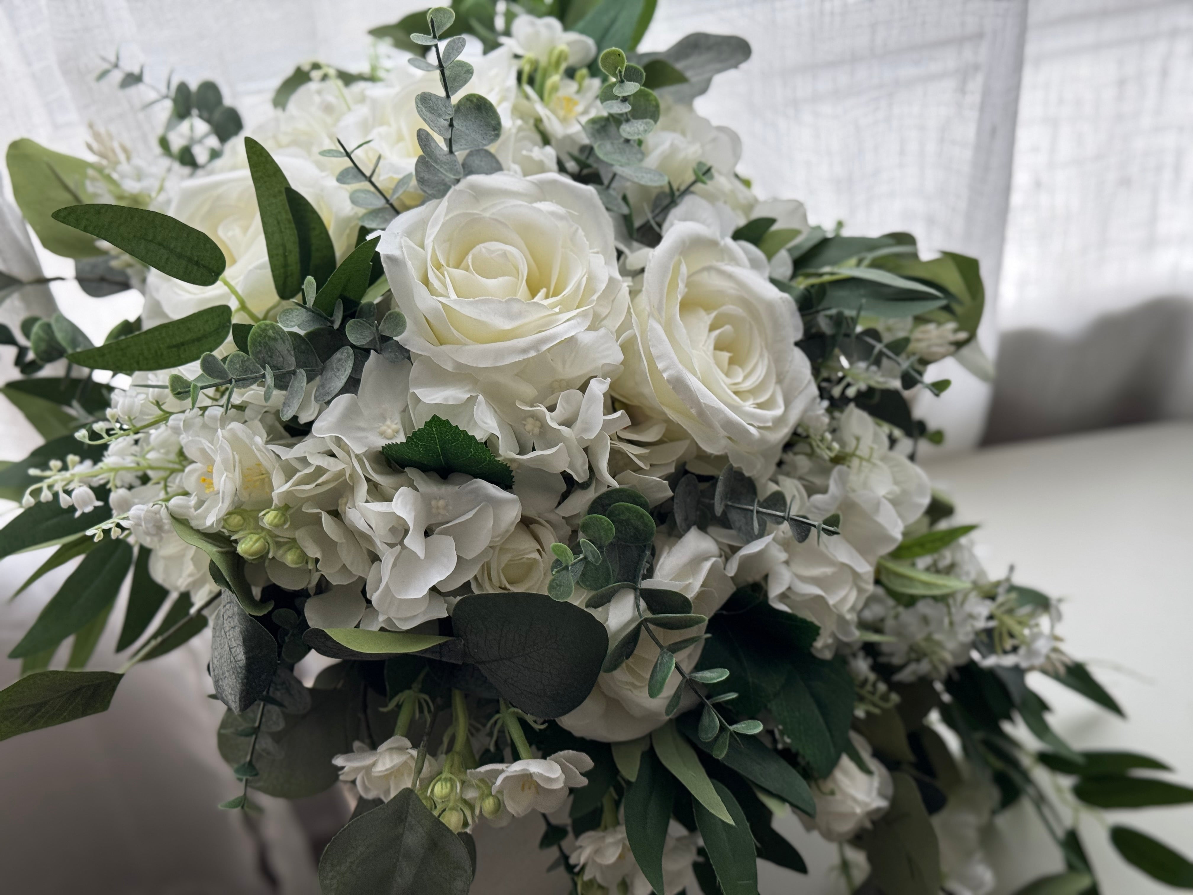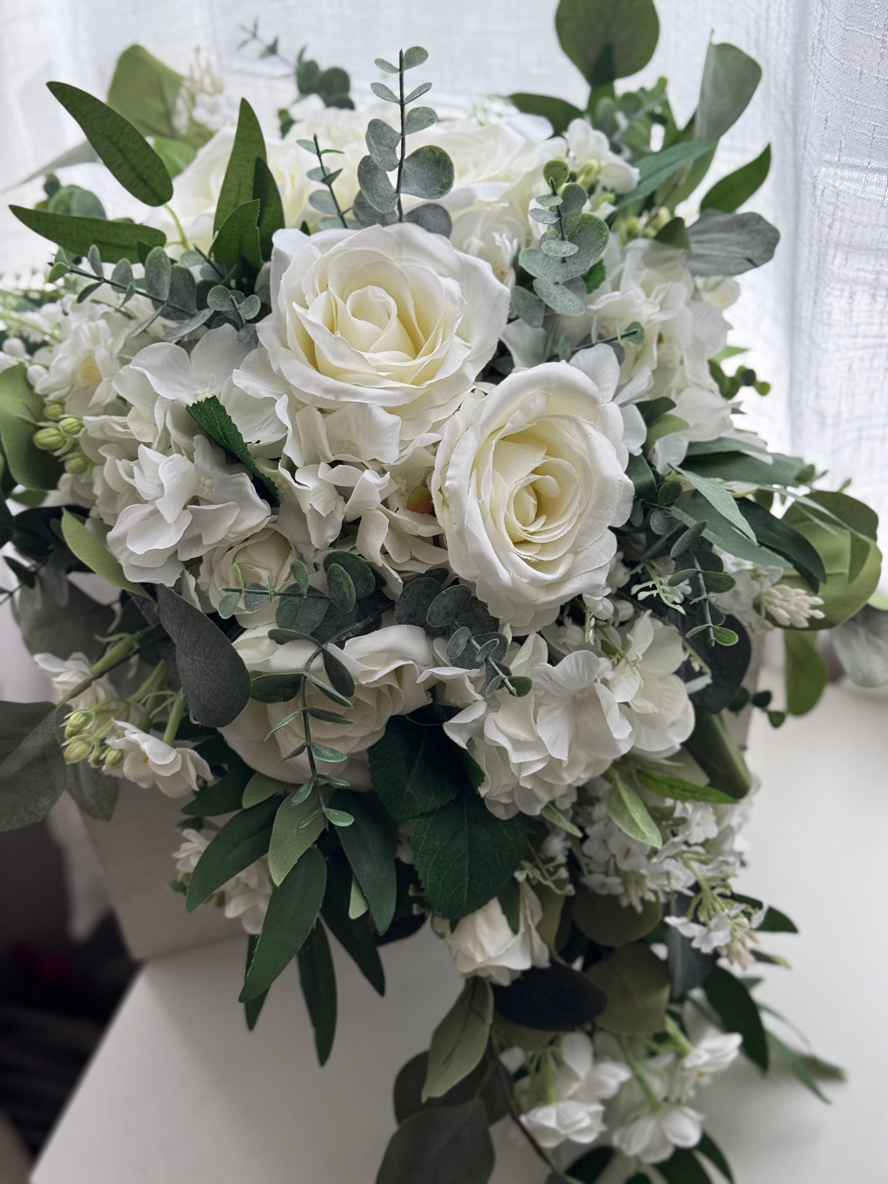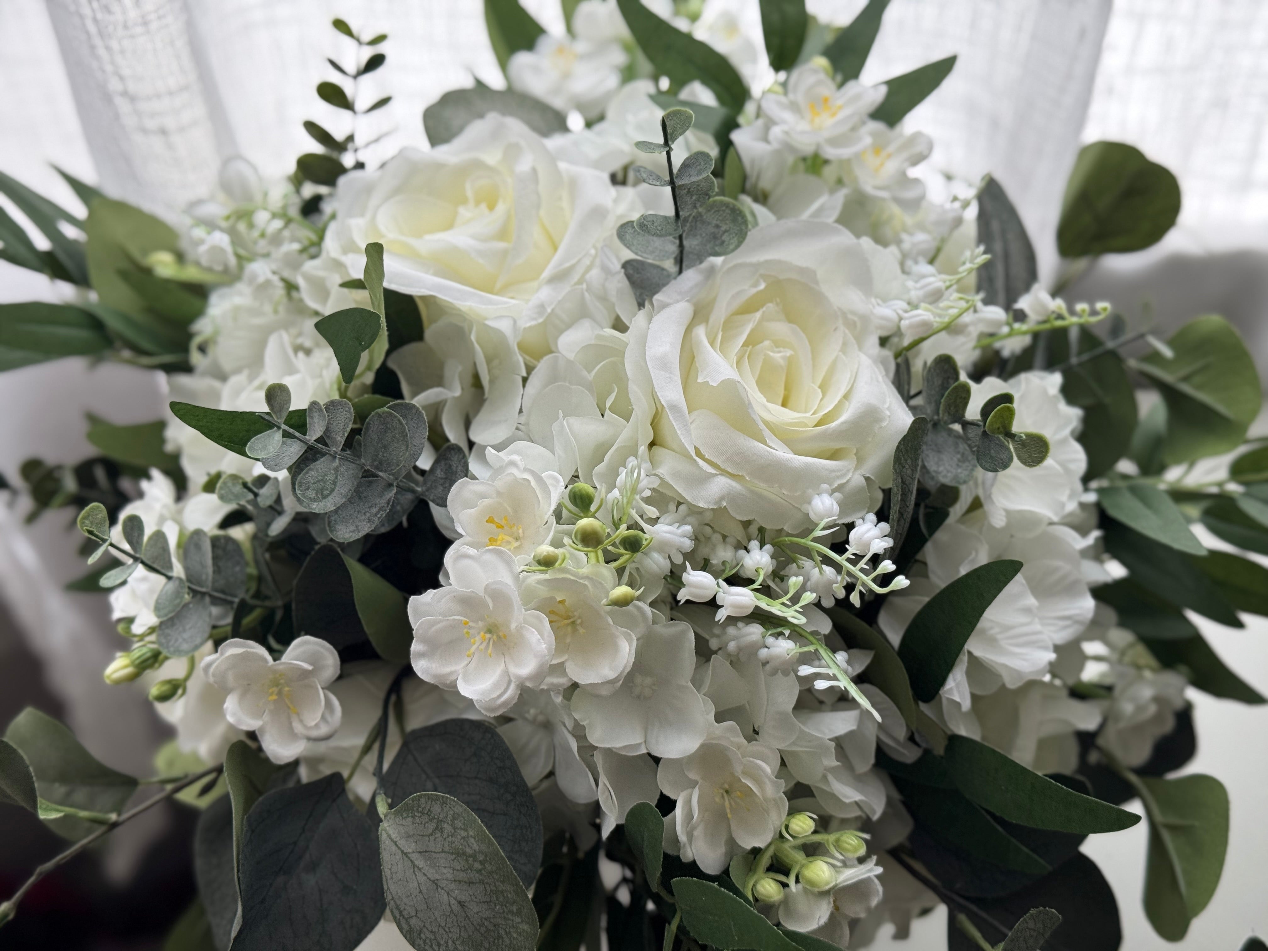 Elegant silk wedding flowers designed with ivory roses, white hydrangea, blossom and mixed greenery.