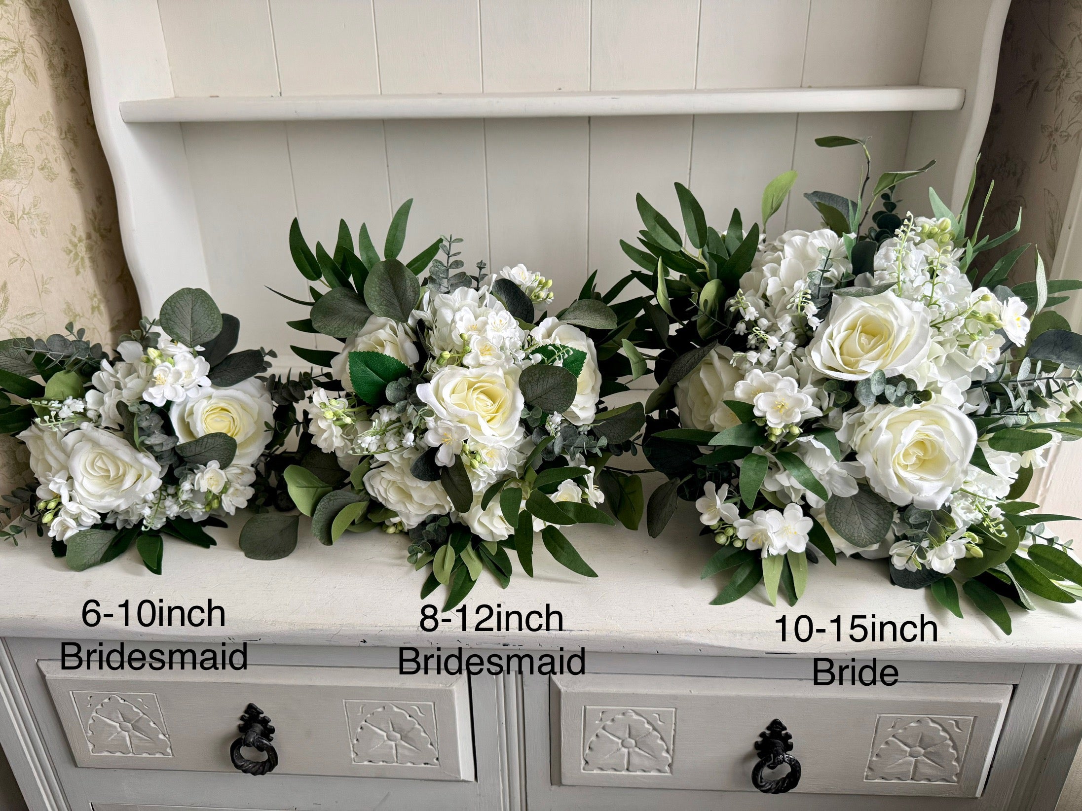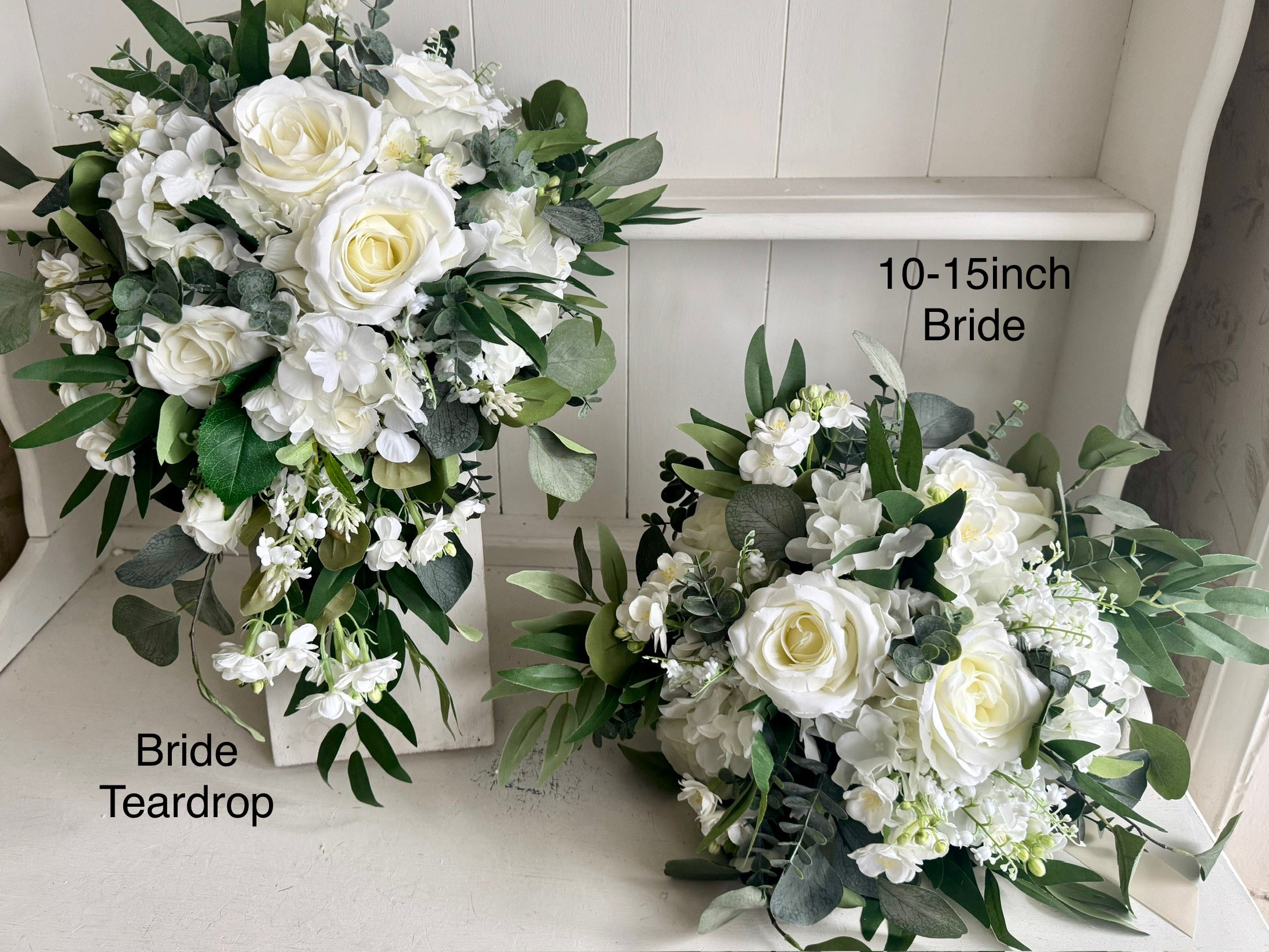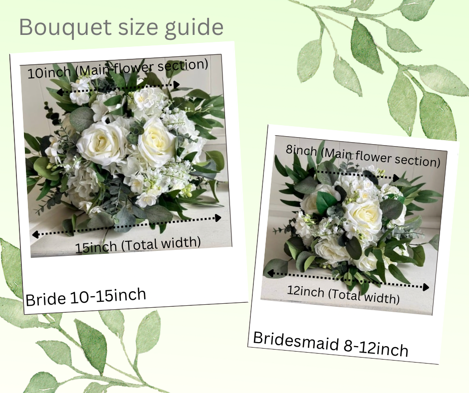 This bouquet design is available in 6 approximate different sizes, - Bride Teardrop (10x17inch), 12-17inch Bride, 10-15inch Bride, 8-12inch Bridesmaid, 6-10inch Bridesmaid and 4inch Flower girl.