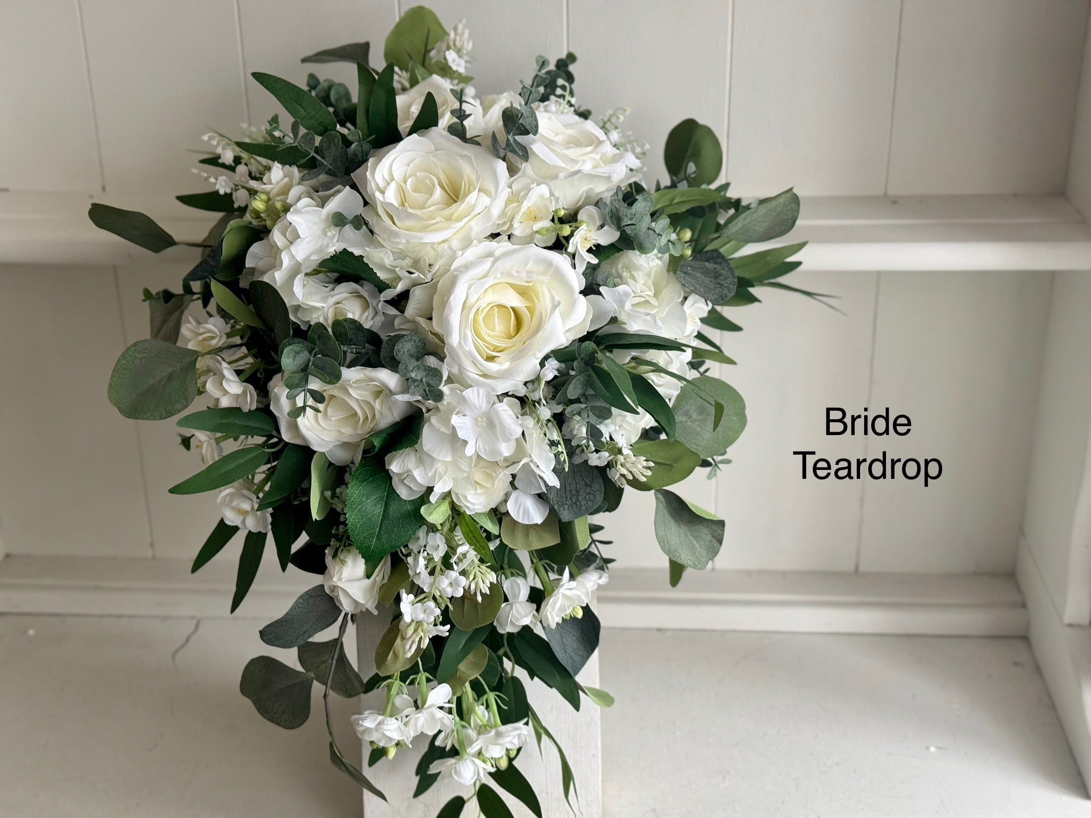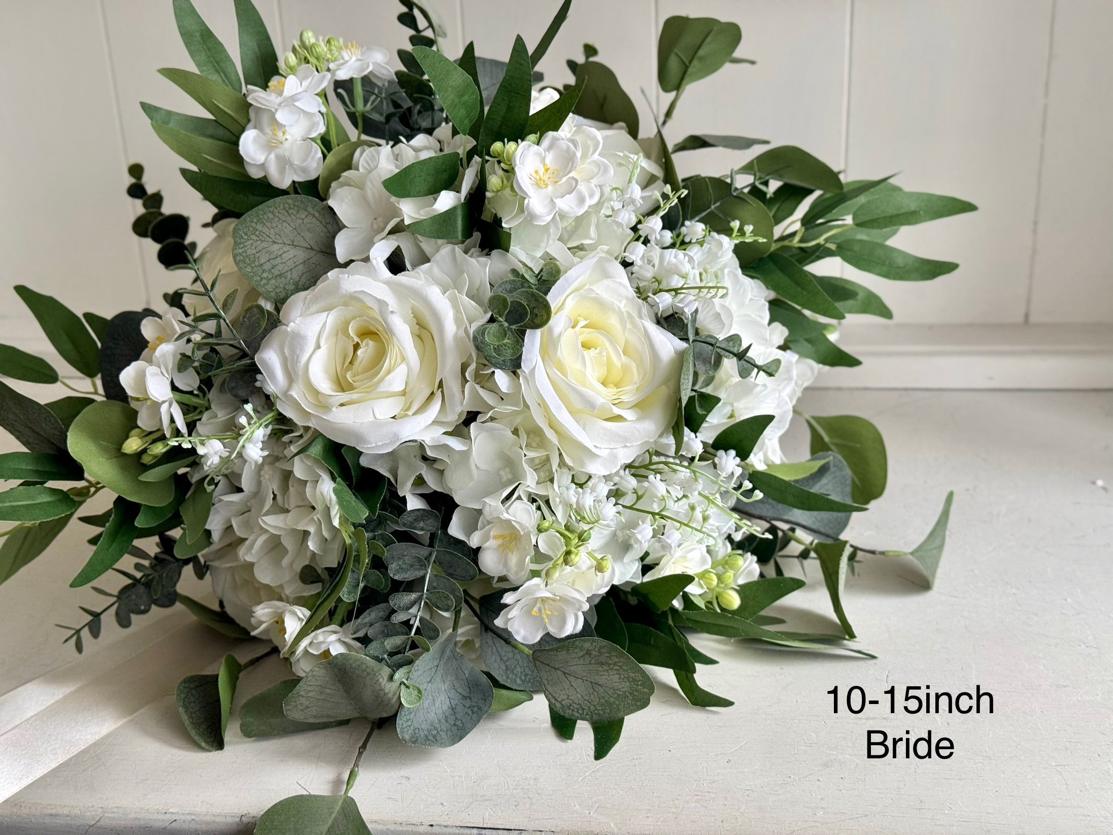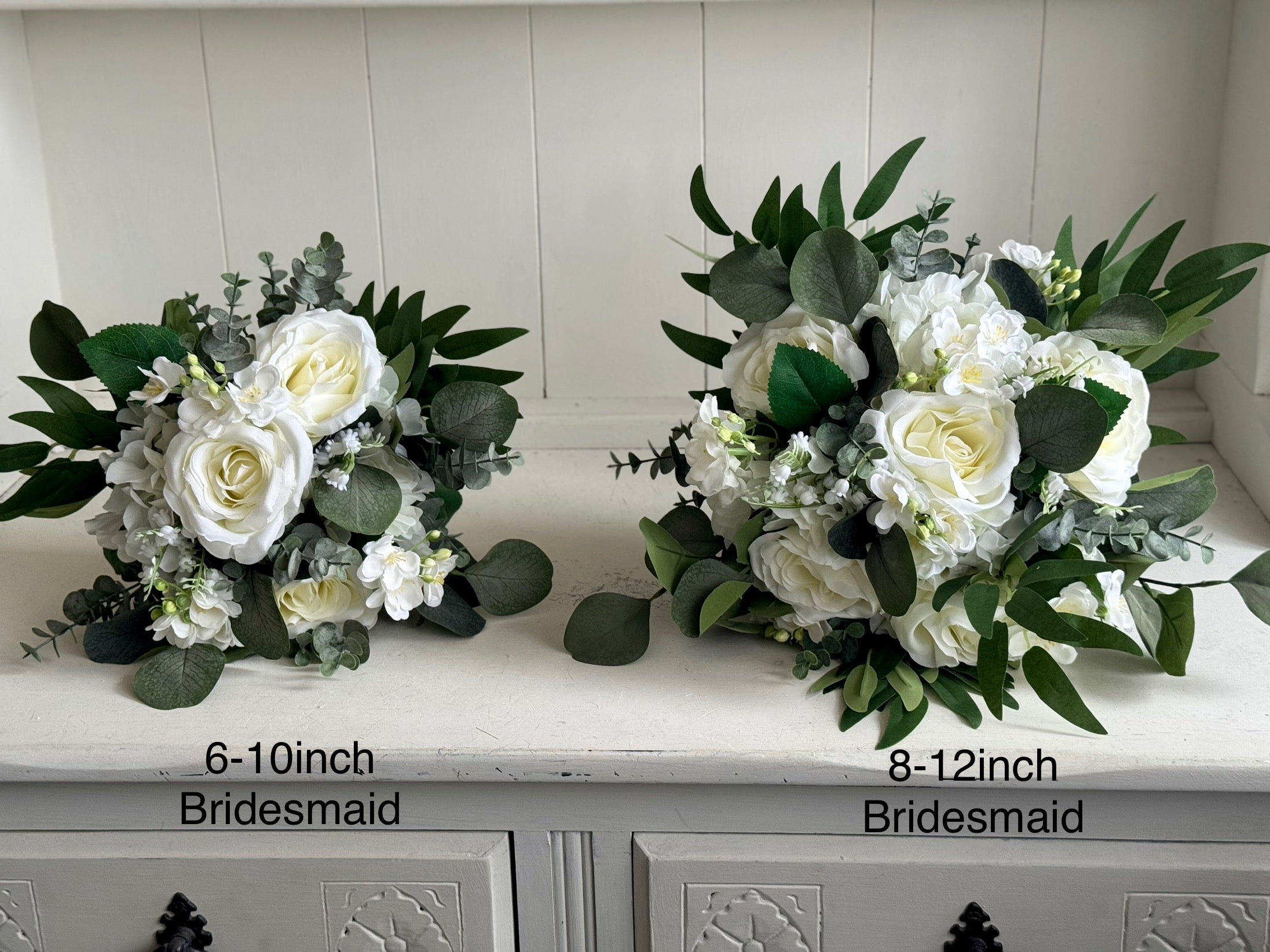 This bouquet design is available in 6 approximate different sizes, - Bride Teardrop (10x17inch), 12-17inch Bride, 10-15inch Bride, 8-12inch Bridesmaid, 6-10inch Bridesmaid and 4inch Flower girl.