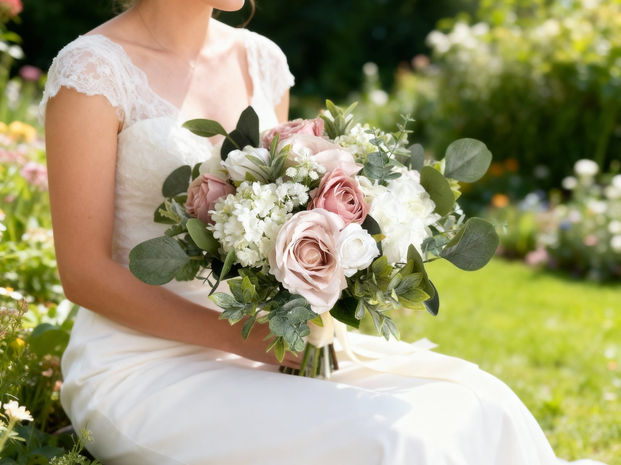 Natural silk wedding flowers in shades of blush pink, dusky pink and white. Flowers include roses, hydrangea, virburnum and gypsophila mixed with dusty miller, lambs ear, sage and eucalyptus greenery.
