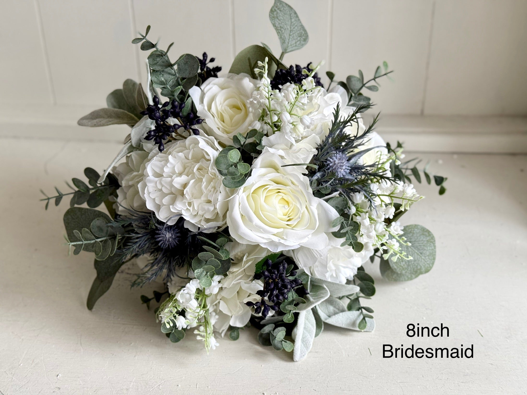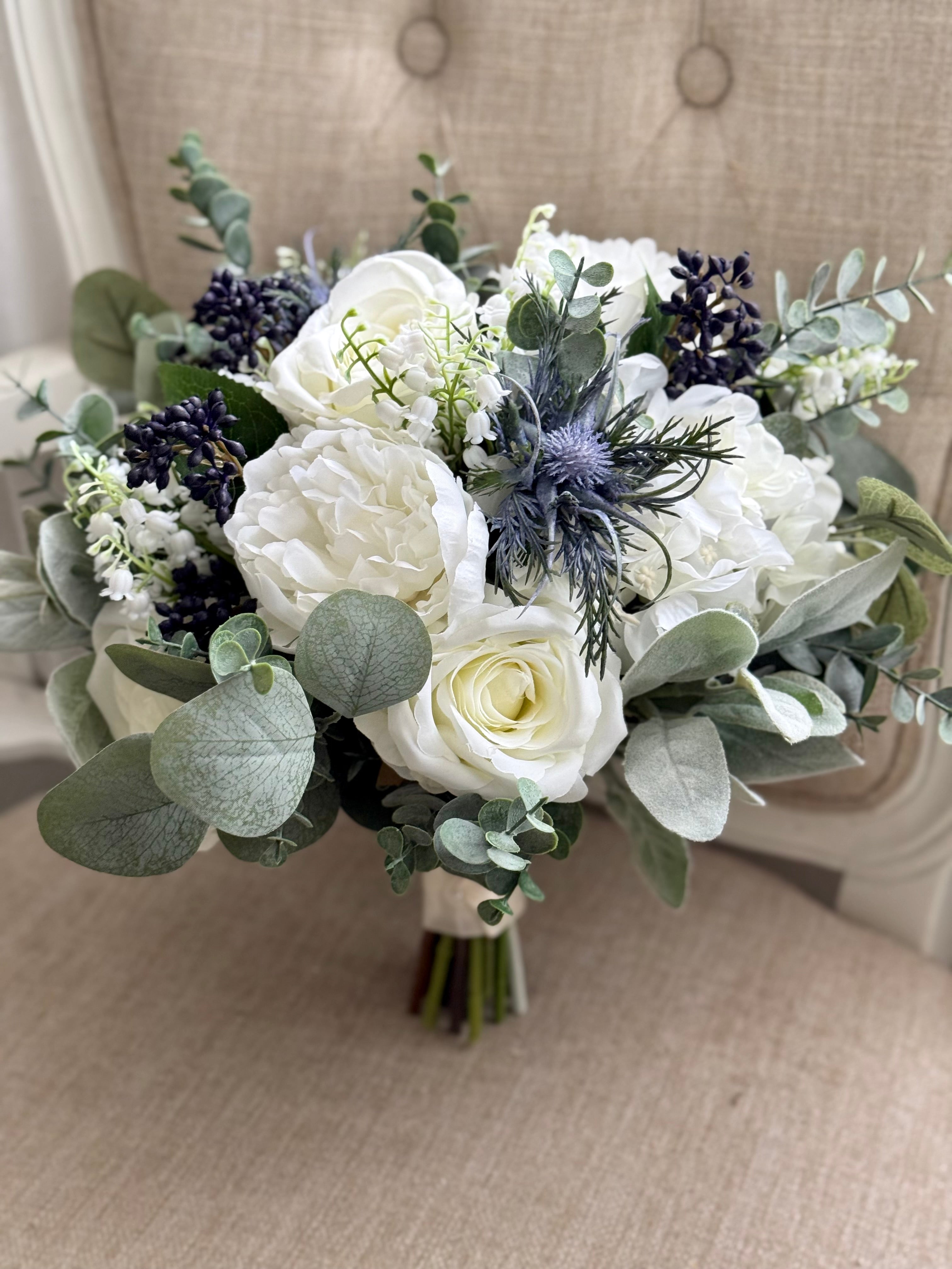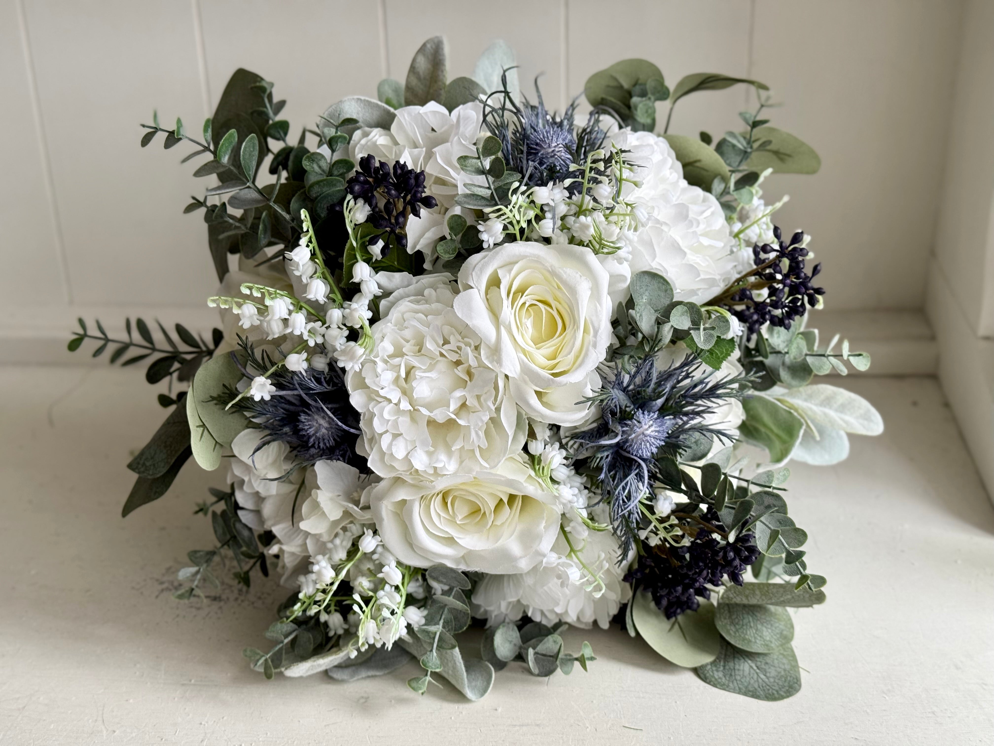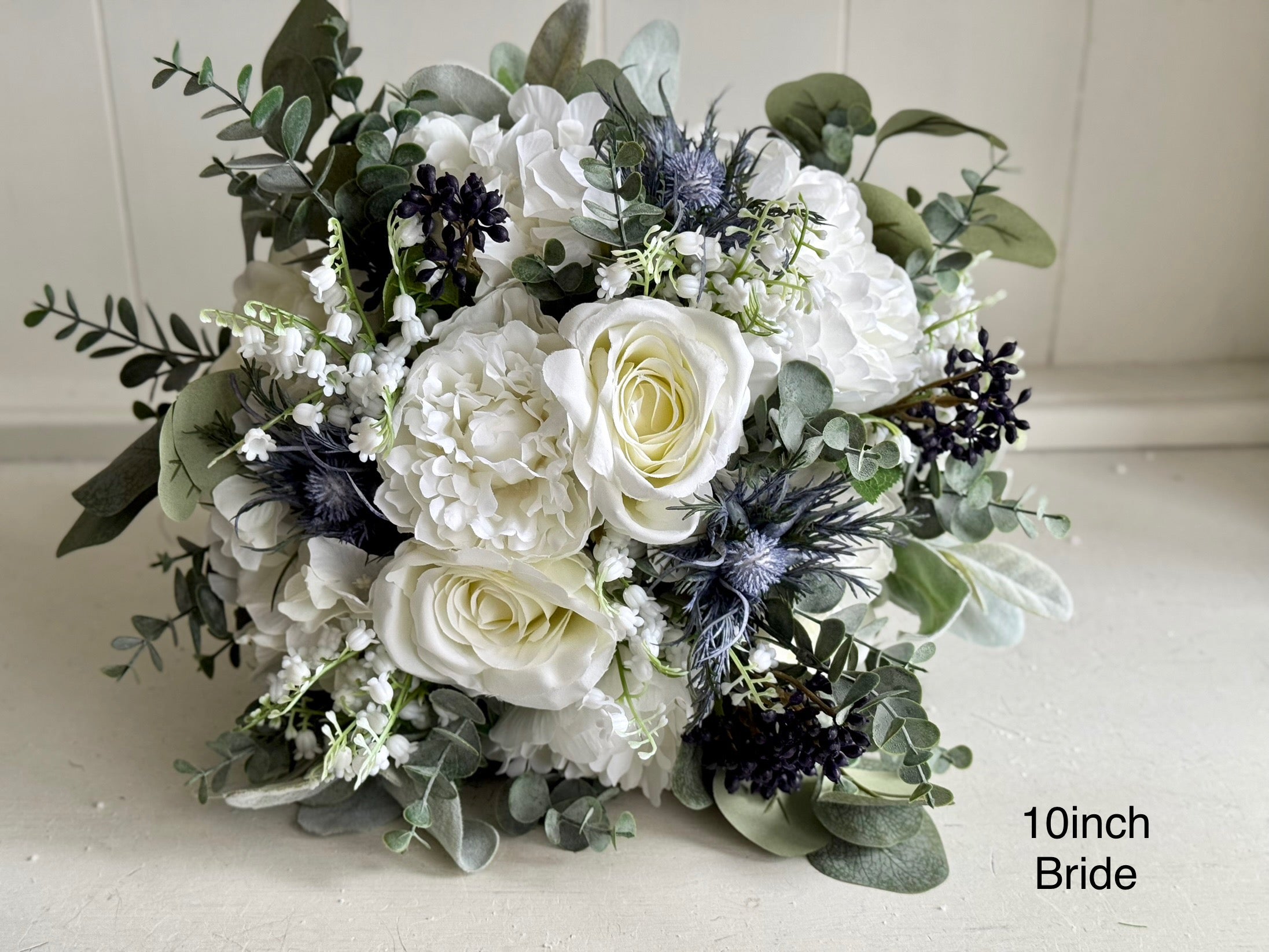White and navy blue silk wedding bouquet. Made with artificial roses, hydrangea, peonies, Lily of the valley, viburnum berries, thistle, lambs ear and eucalyptus greenery.