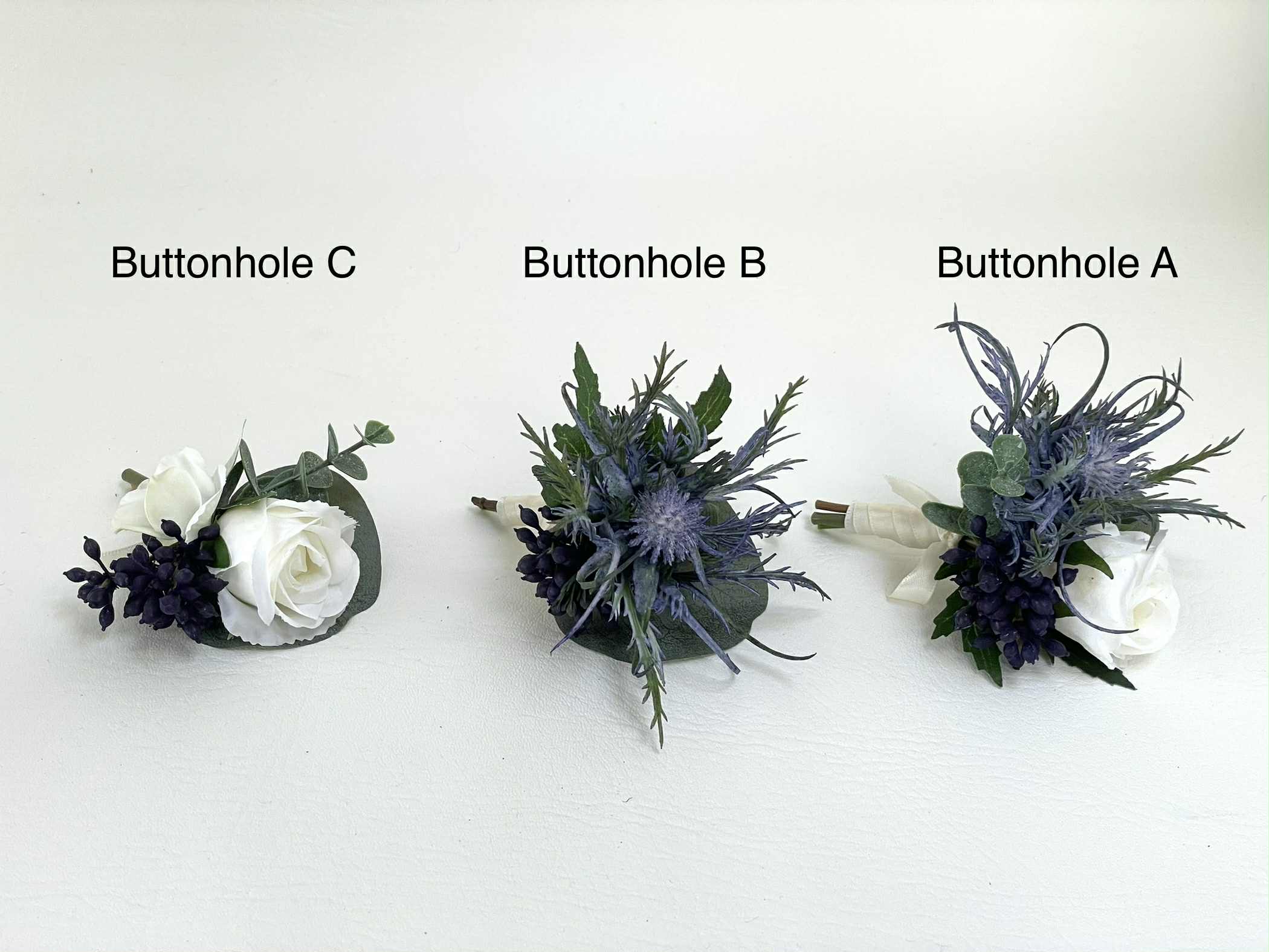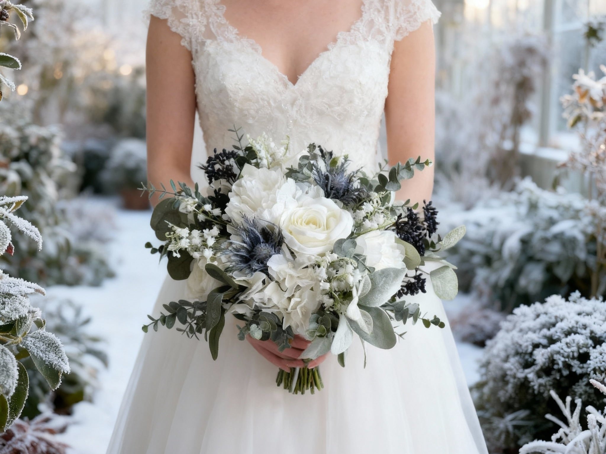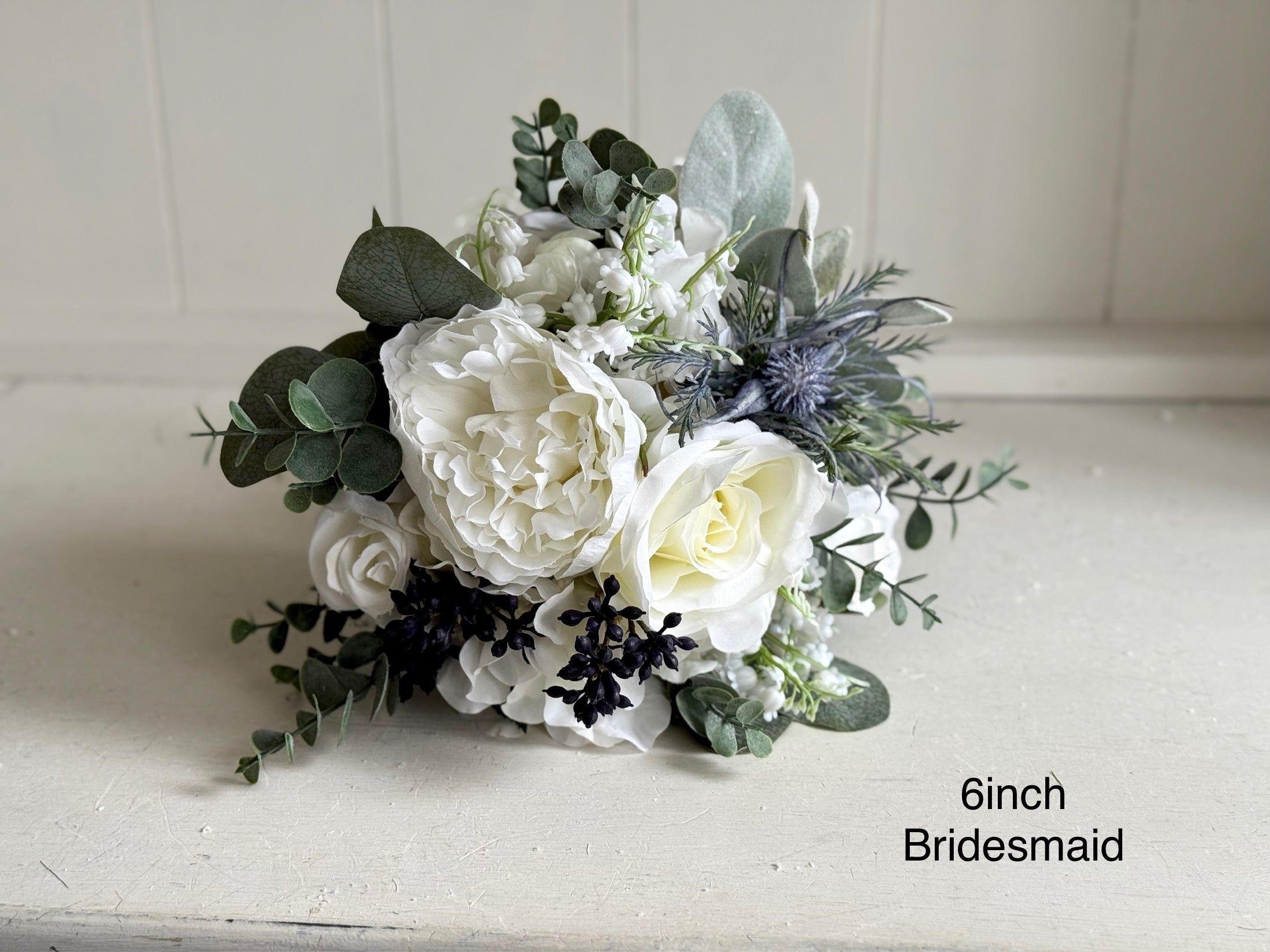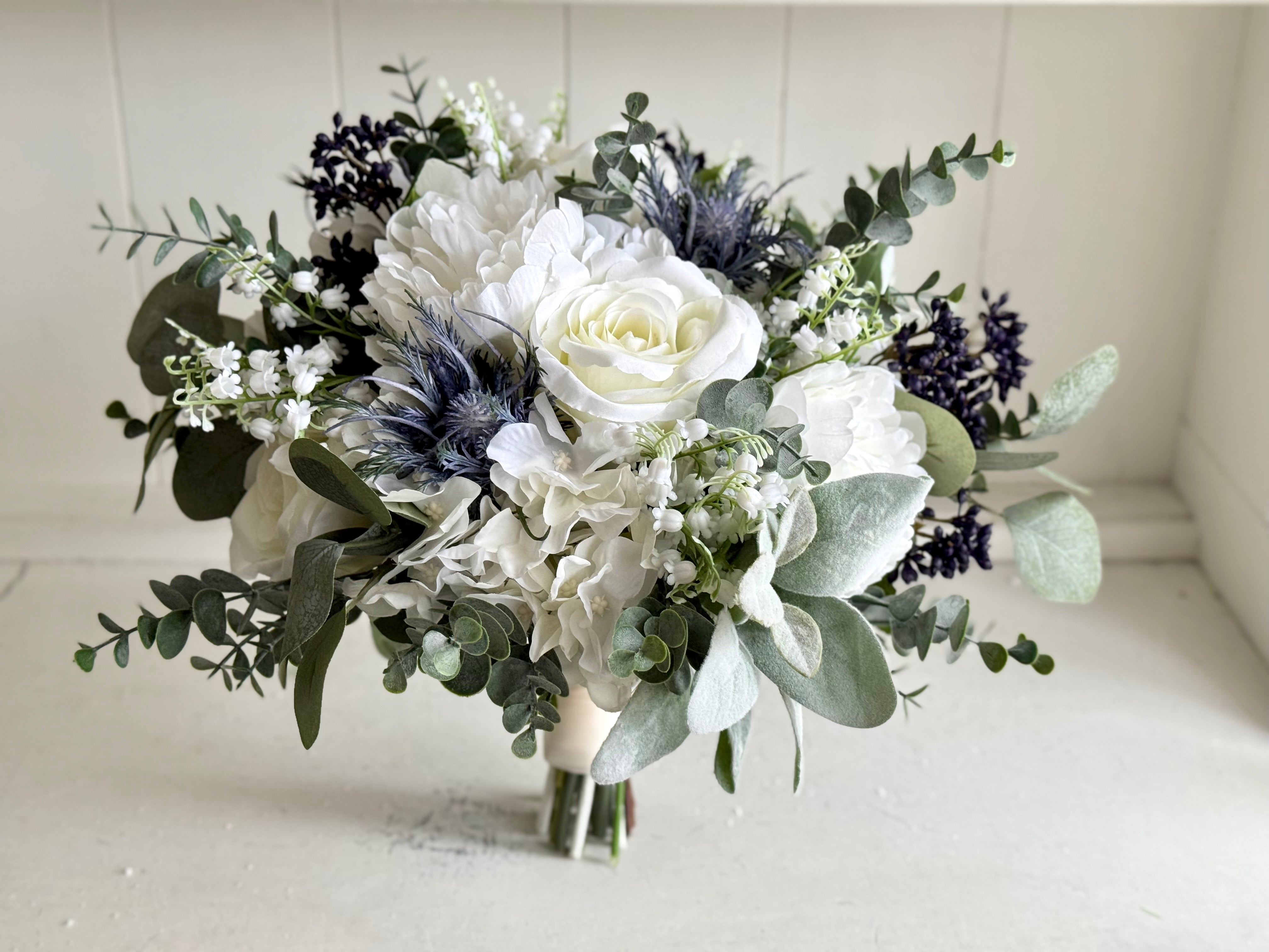 White and navy blue silk wedding bouquet. Made with artificial roses, hydrangea, peonies, Lily of the valley, viburnum berries, thistle, lambs ear and eucalyptus greenery.
