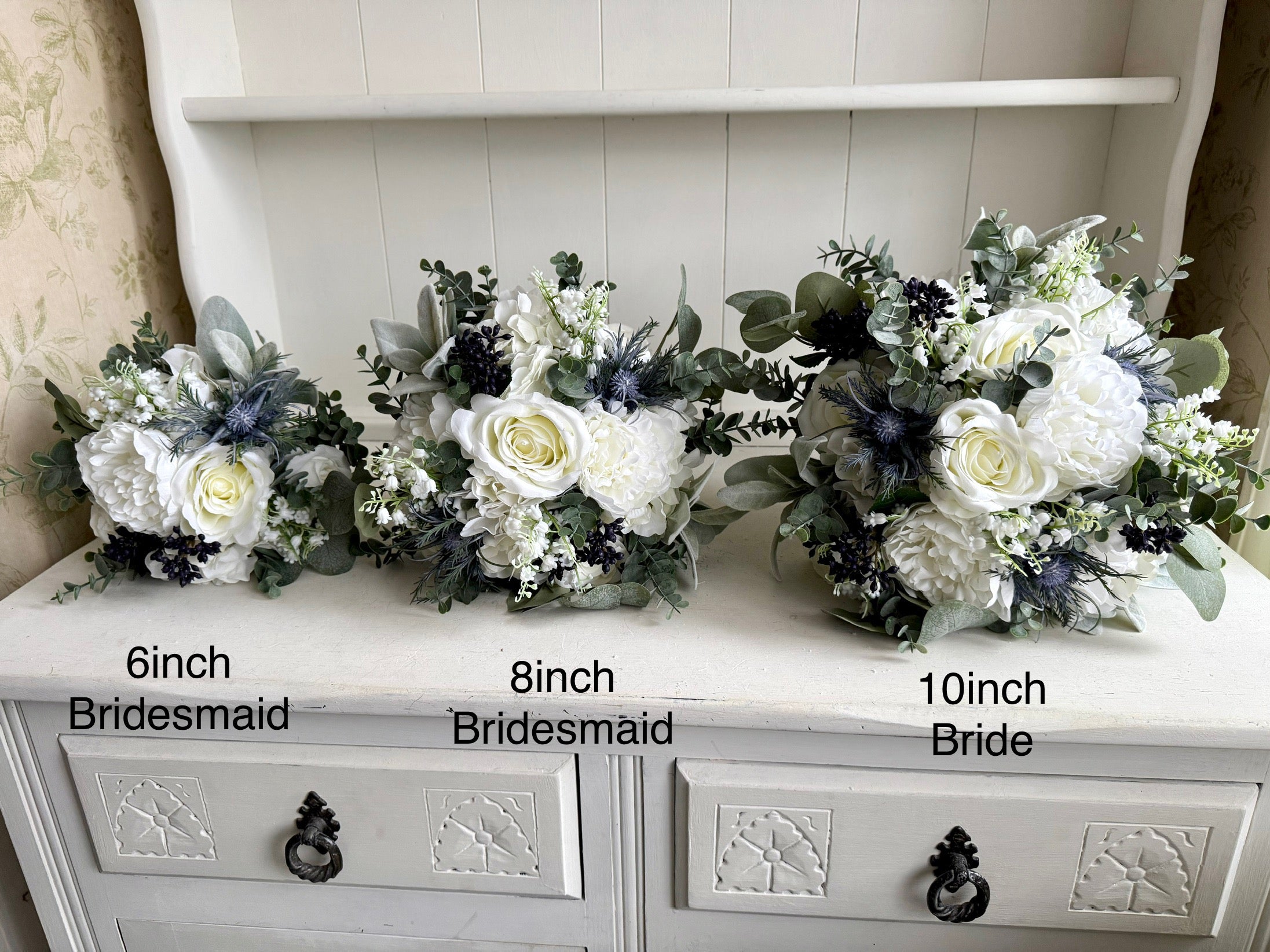 The bouquet shown in the photos is the 10inch bride bouquet size unless stated differently on the picture.