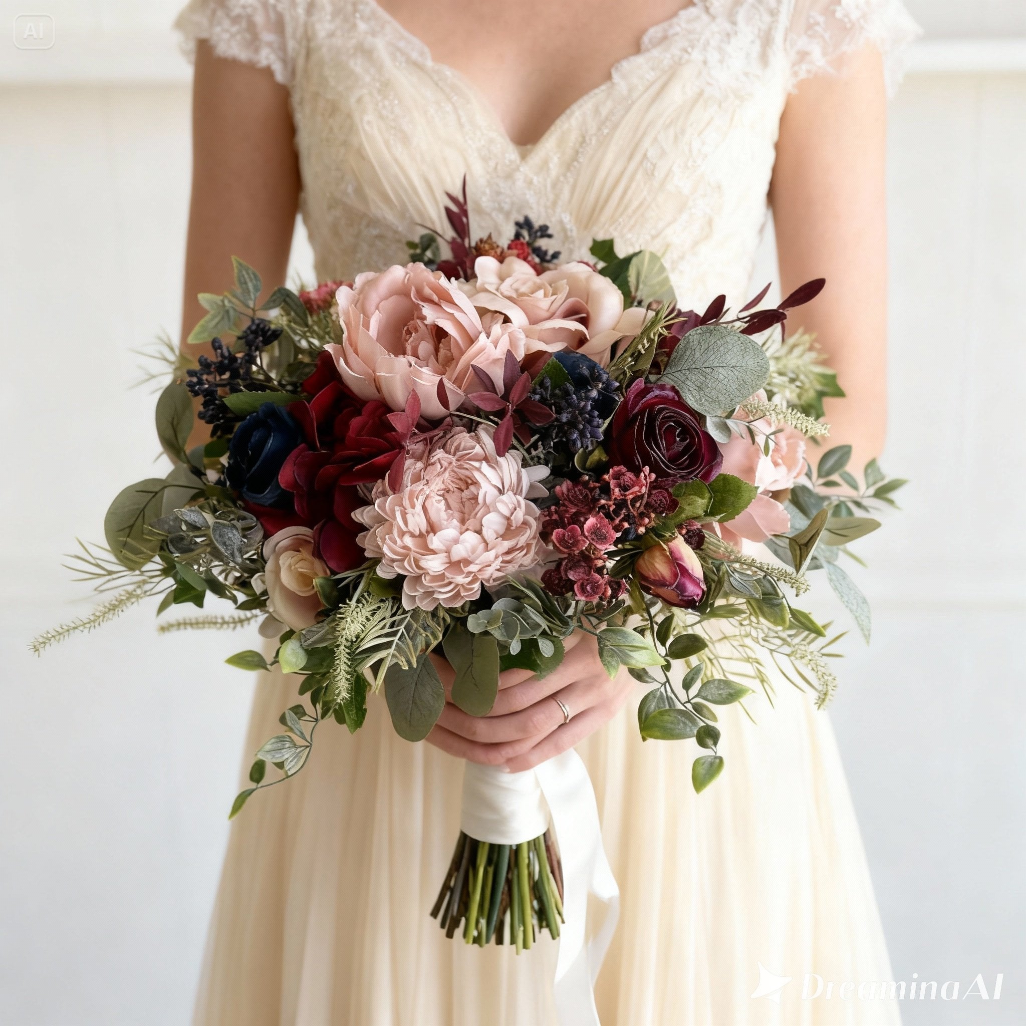 Rustic artificial wedding flowers in shades of blush pink, burgundy and navy blue. Flowers include roses, peonies, hydrangea, viburnum berries and mixed greenery.