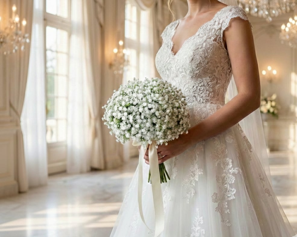 Artificial white gypsophila (baby’s breath) wedding bouquets and matching items.
